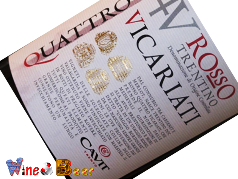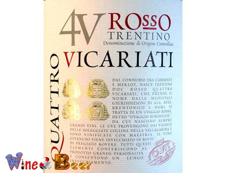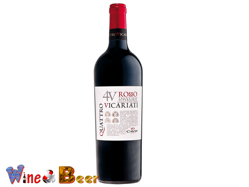 Rượu vang Cavit 4V Quattro Vicariati Rosso Trentino mãnh liệt ruby màu đỏ với vị cam. Mũi hơi cay với một thành phần thanh tao khác biệt, khô, cân bằng trên vòm miệng.